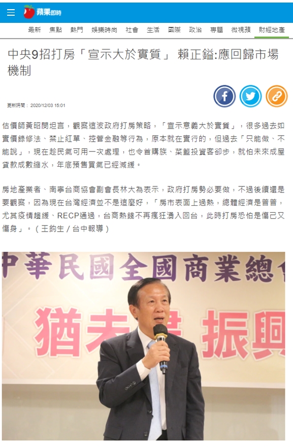 商總理事長、鄉林集團董事長賴正鎰表示,藉由預售屋轉手獲利,只要合法繳稅就沒關係,但房地產業界本應自律、不炒作議題,政府稽查來遏制短期預售紅單炒作、降低不動產風險,各界樂見其成。至於實價登錄修法是原本預期的改革方向,讓市場更加透明化。