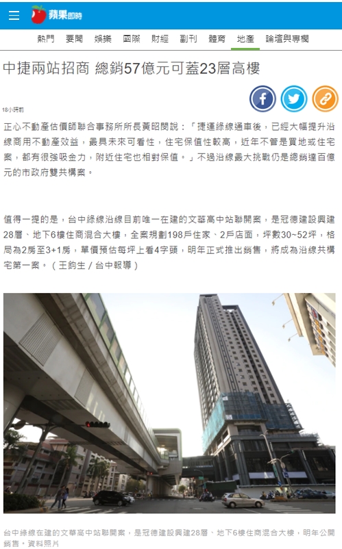 值得一提的是,台中綠線沿線目前唯一在建的文華高中站聯開案,是冠德建設興建28層、地下6樓住商混合大樓,全案規劃198戶住家、2戶店面,坪數30~52坪,格局為2房至3+1房,單價預估每坪上看4字頭,明年正式推出銷售,將成為沿線共構宅第一案。