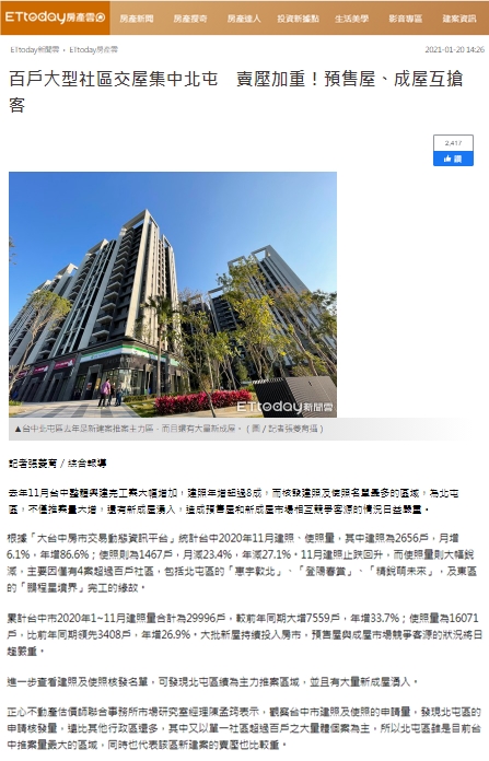 1月台中整體興建完工案大幅增加,建照年增超過8成,而核發建照及使照名單最多的區域,為北屯區,不僅推案量大增,還有新成屋湧入,造成預售屋和新成屋市場相互競爭客源的情況日益嚴重。