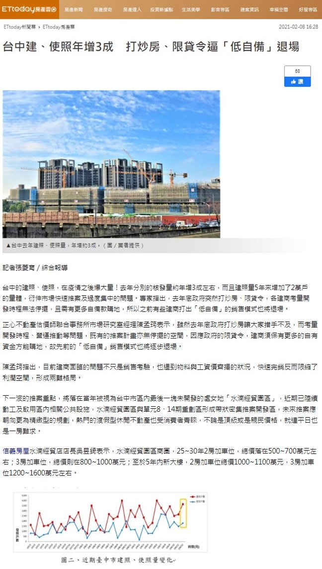 「大台中房市交易動態資訊平台」發布2月份大台中房市分析月報,統計2020年台中建照量合計為33650戶,與2019年相比大增8155戶,年增32%;使照量為17868戶,比2019年增加4054戶,年增29.3%。