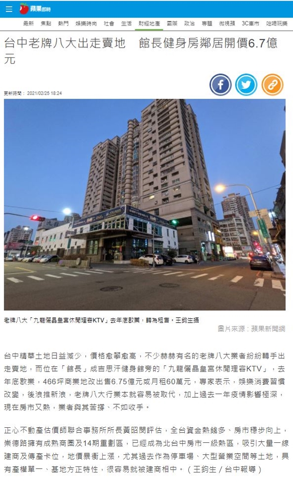 台中精華土地日益減少,價格愈攀愈高,不少赫赫有名的老牌八大業者紛紛轉手出走賣地,而位在「館長」成吉思汗健身館旁的「九龍儷晶皇宮休閒理容KTV」,去年底歇業,466坪商業地改出售6.75億元或月租60萬元,專家表示,娛樂消費習慣改變,後浪推新浪,老牌八大行業本就容易被取代,加上過去一年疫情影響極深,現在房市又熱,業者與其苦撐、不如收手。