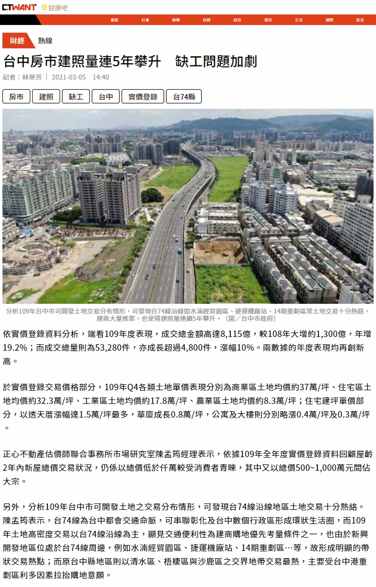 「大臺中房市交易動態資訊平台」發布109年大台中房市分析年報,109年建物買賣登記棟數連續4年正成長,建照量則連續5年攀升,較104年以來成長了2.64倍,市場快速且過度集中推案的問題,各案場開工時程若無法分流,將使缺工問題加劇惡化。