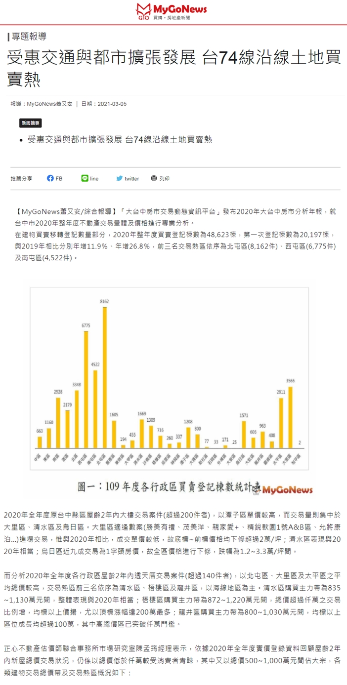 「大台中房市交易動態資訊平台」發布2020年大台中房市分析年報,就台中市2020年整年度不動產交易量體及價格進行專業分析。