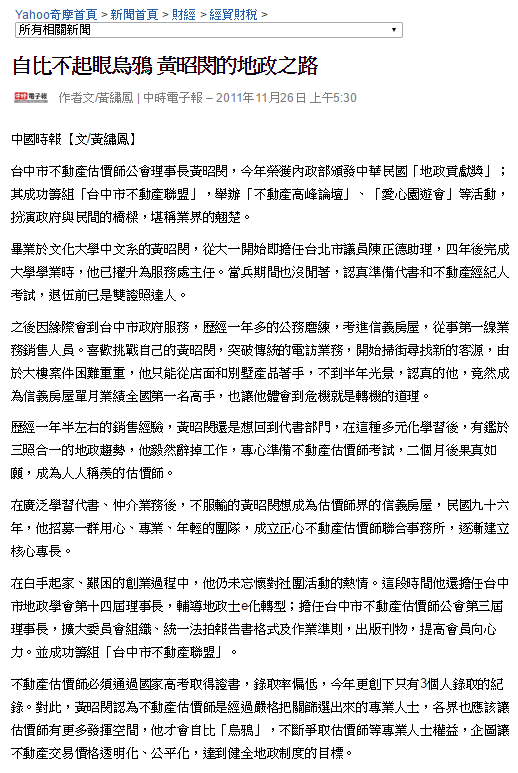 不動產估價師必須通過國家高考取得證書,錄取率偏低,今年更創下只有3個人錄取的紀錄。對此,黃昭閔認為不動產估價師是經過嚴格把關篩選出來的專業人士,各界也應該讓估價師有更多發揮空間,他才會自比「烏鴉」,不斷爭取估價師等專業人士權益,企圖讓不動產交易價格透明化、公平化,達到健全地政制度的目標。