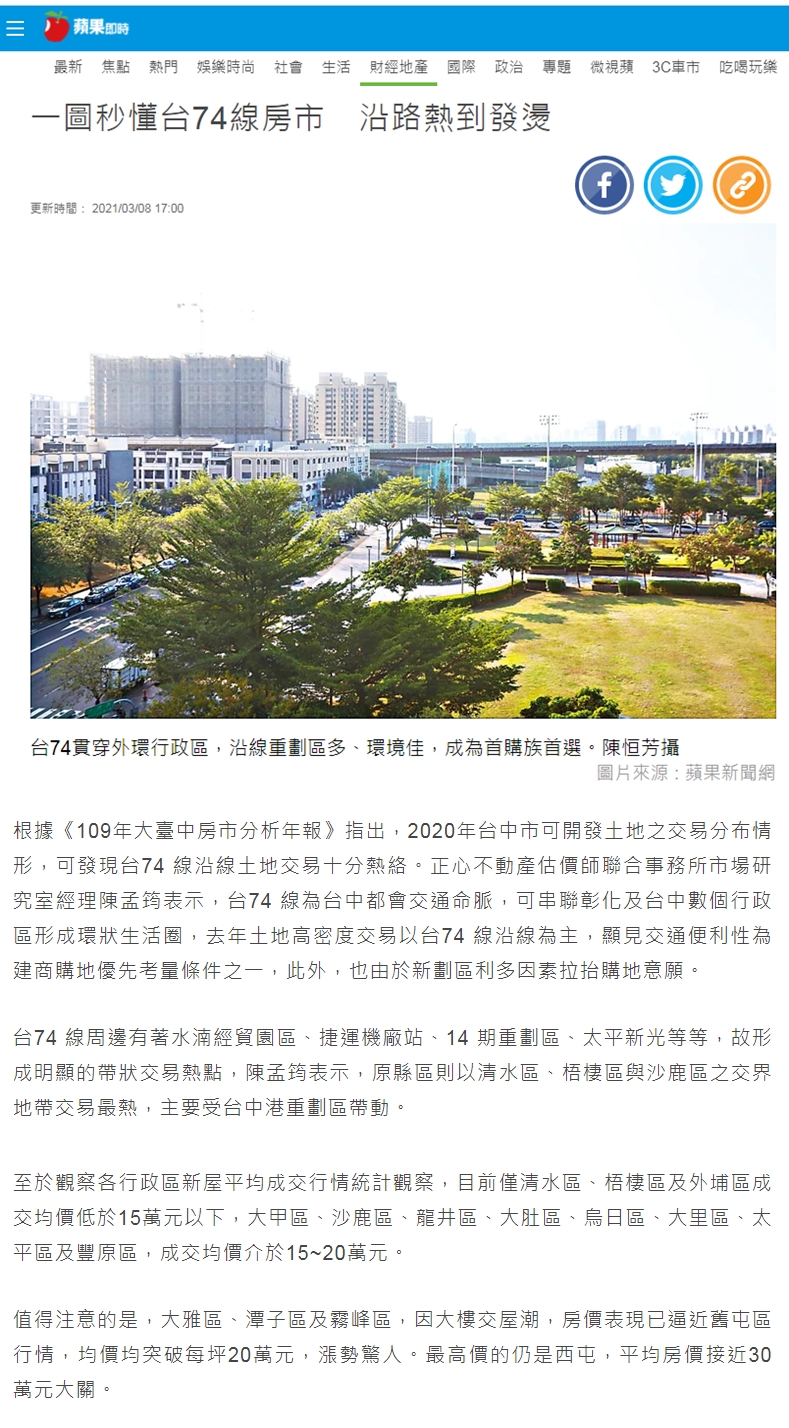 根據《109年大臺中房市分析年報》指出,2020年台中市可開發土地之交易分布情形,可發現台74 線沿線土地交易十分熱絡。正心不動產估價師聯合事務所市場研究室經理陳孟筠表示,台74 線為台中都會交通命脈,可串聯彰化及台中數個行政區形成環狀生活圈,去年土地高密度交易以台74 線沿線為主,顯見交通便利性為建商購地優先考量條件之一,此外,也由於新劃區利多因素拉抬購地意願。