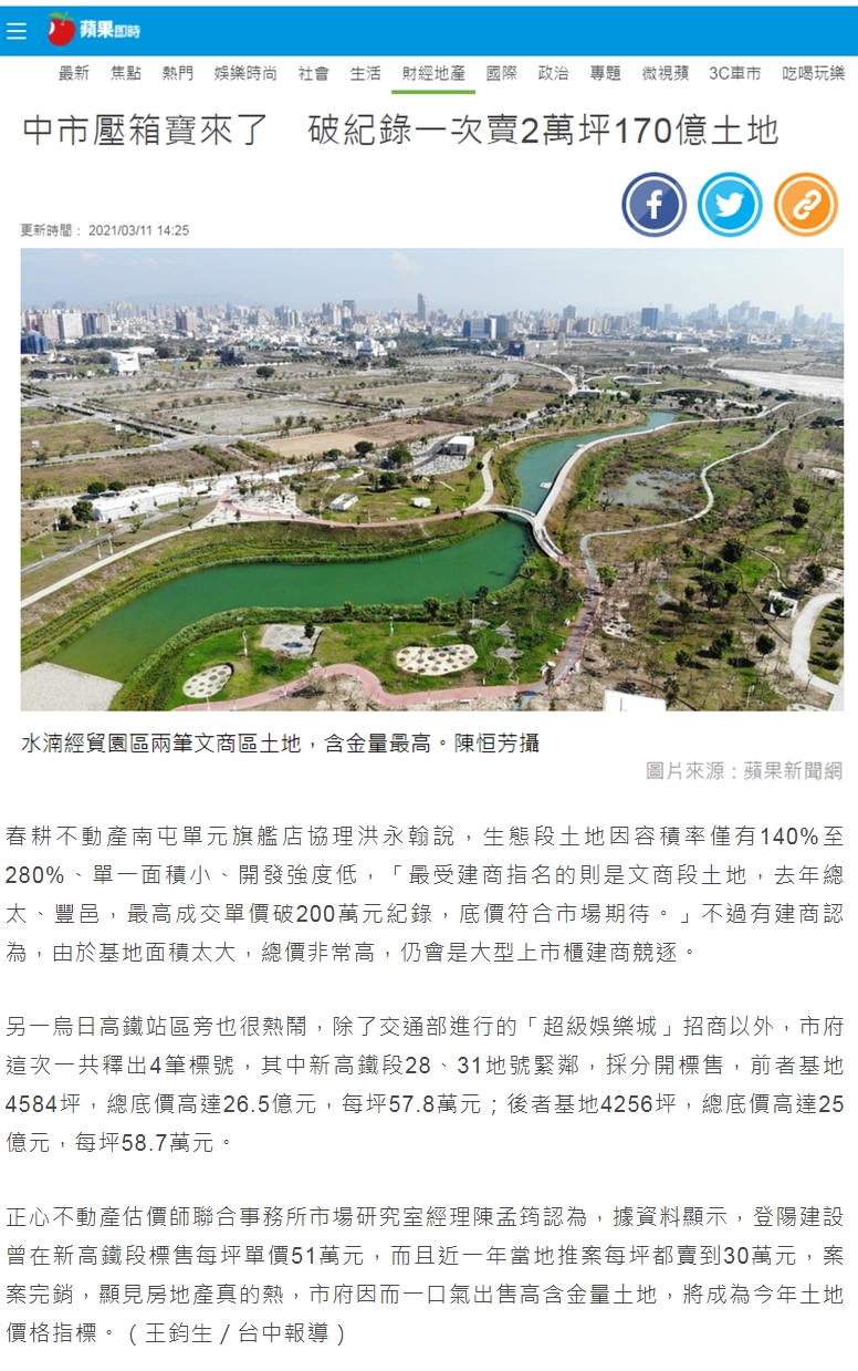 正心不動產估價師聯合事務所市場研究室經理陳孟筠認為,據資料顯示,登陽建設曾在新高鐵段標售每坪單價51萬元,而且近一年當地推案每坪都賣到30萬元,案案完銷,顯見房地產真的熱,市府因而一口氣出售高含金量土地,將成為今年土地價格指標。