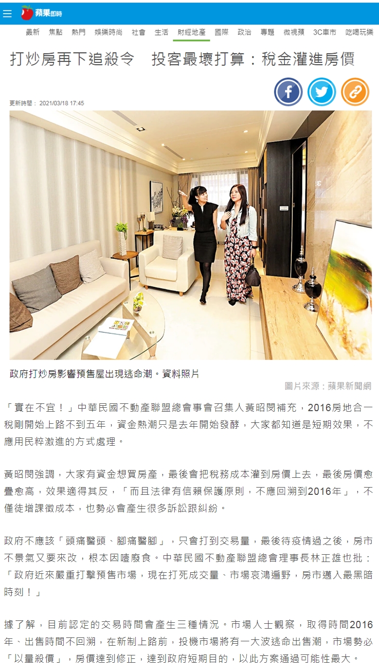 「實在不宜!」中華民國不動產聯盟總會事會召集人黃昭閔補充,2016房地合一稅剛開始上路不到五年,資金熱潮只是去年開始發酵,大家都知道是短期效果,不應用民粹激進的方式處理。