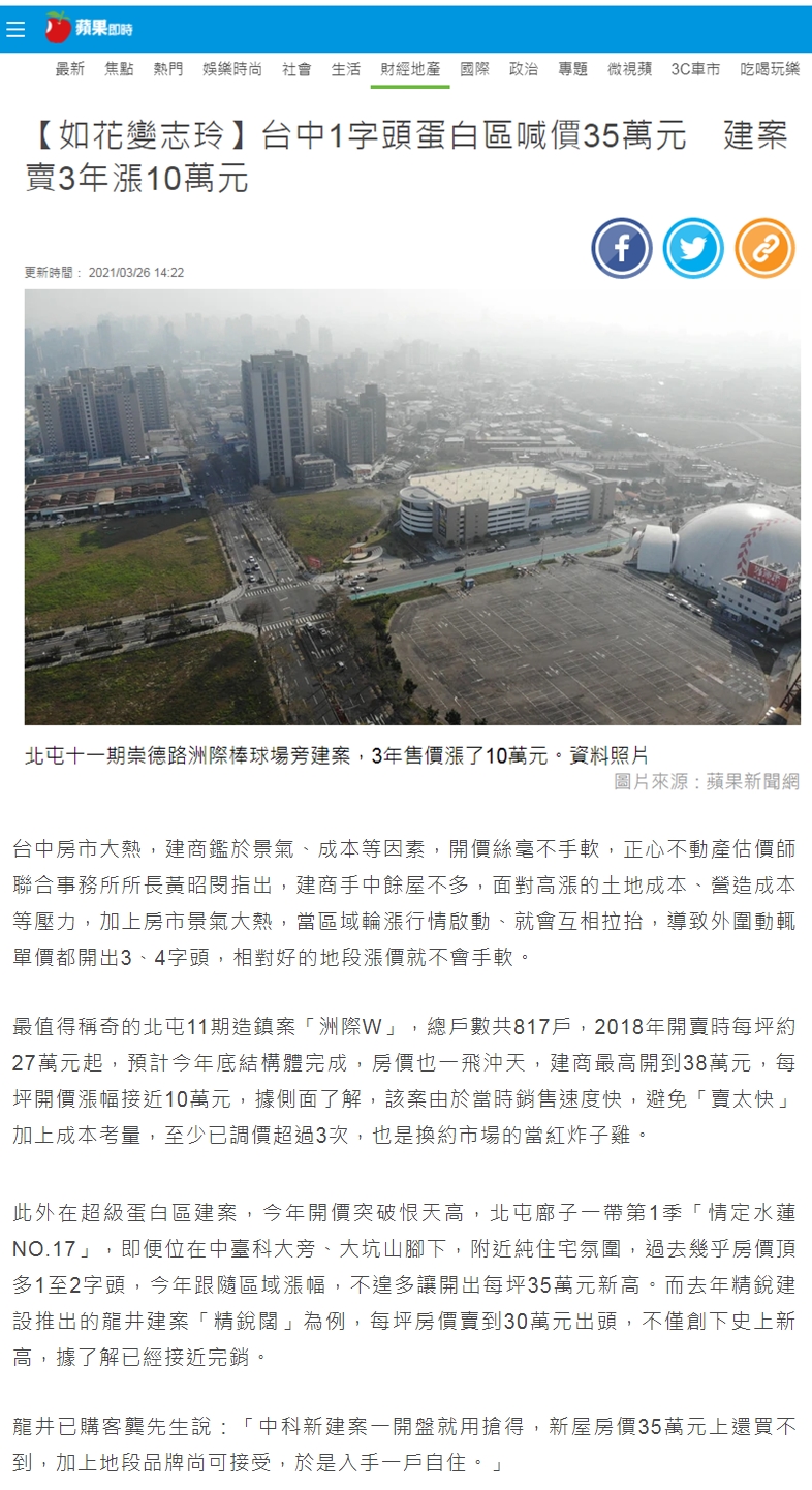 此外在超級蛋白區建案,今年開價突破恨天高,北屯廍子一帶第1季「情定水蓮NO.17」,即便位在中臺科大旁、大坑山腳下,附近純住宅氛圍,過去幾乎房價頂多1至2字頭,今年跟隨區域漲幅,不遑多讓開出每坪35萬元新高。而去年精銳建設推出的龍井建案「精銳闊」為例,每坪房價賣到30萬元出頭,不僅創下史上新高,據了解已經接近完銷。