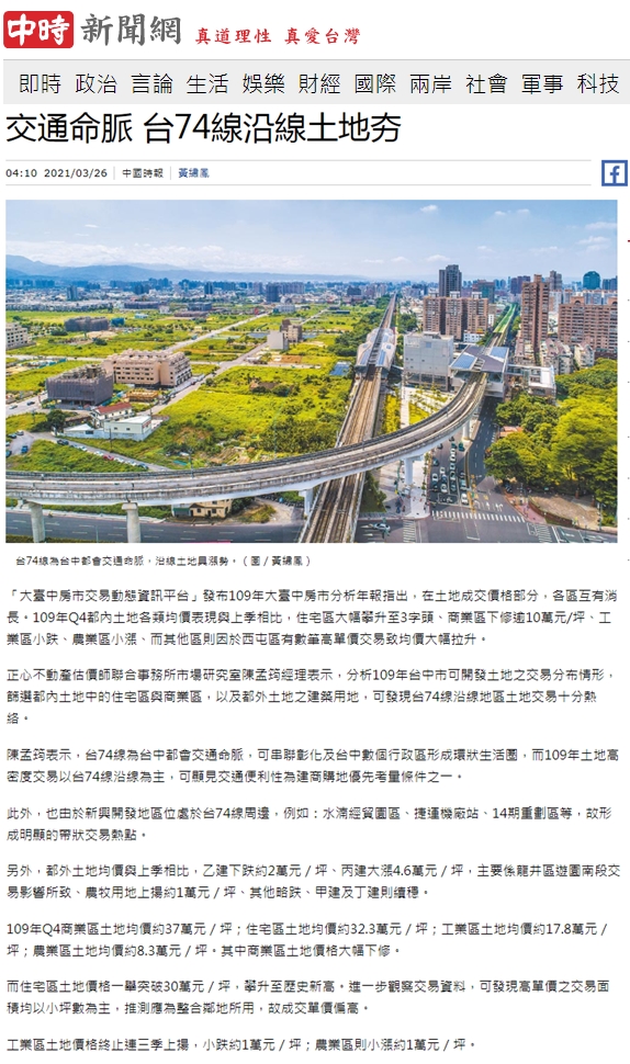 陳孟筠表示,台74線為台中都會交通命脈,可串聯彰化及台中數個行政區形成環狀生活圈,而109年土地高密度交易以台74線沿線為主,可顯見交通便利性為建商購地優先考量條件之一。