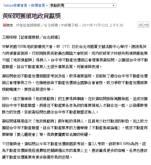 中華民國100年地政節慶祝大會,昨(11)日於台北市國軍文藝活動中心舉行,總統馬英九特頒書面賀詞,行政院院長吳敦義也親臨大會致詞,而內政部常次林慈玲則頒獎嘉勉第16屆「地政貢獻獎」得獎人。台中市不動產估價師公會理事長黃昭閔,以籌組台中市不動產聯盟,結合不動產專業人士提升專業品質,而獲頒獎表揚。