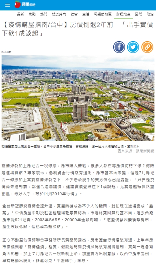 正心不動產估價師聯合事務所所長黃昭閔指出,房市資金行情還沒有退,上半年房市指標就看「疫情延燒」程度,假設短時間疫情狀況沒有獲得控制,買氣一定會有負面影響,加上7月房地合一稅新制上路,加重賣方出脫意願,以台中房市為例,早有鬆動出脫潮,多處可見「平盤轉手」訊息。