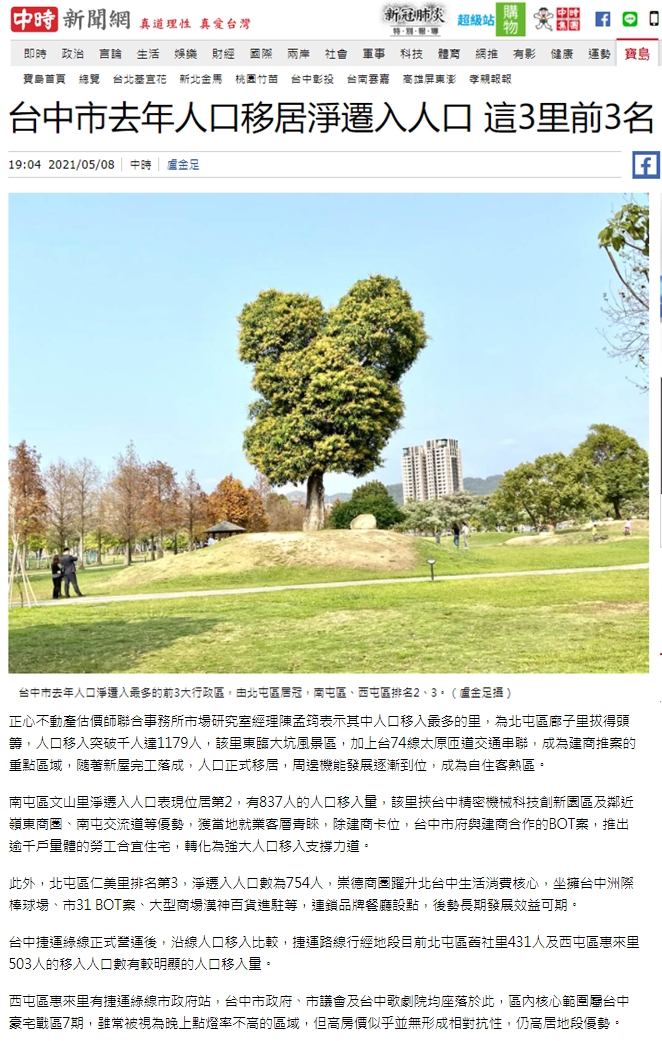 南屯區文山里淨遷入人口表現位居第2,有837人的人口移入量,該里挾台中精密機械科技創新園區及鄰近嶺東商圈、南屯交流道等優勢,獲當地就業客層青睞,除建商卡位,台中市府與建商合作的BOT案,推出逾千戶量體的勞工合宜住宅,轉化為強大人口移入支撐力道。