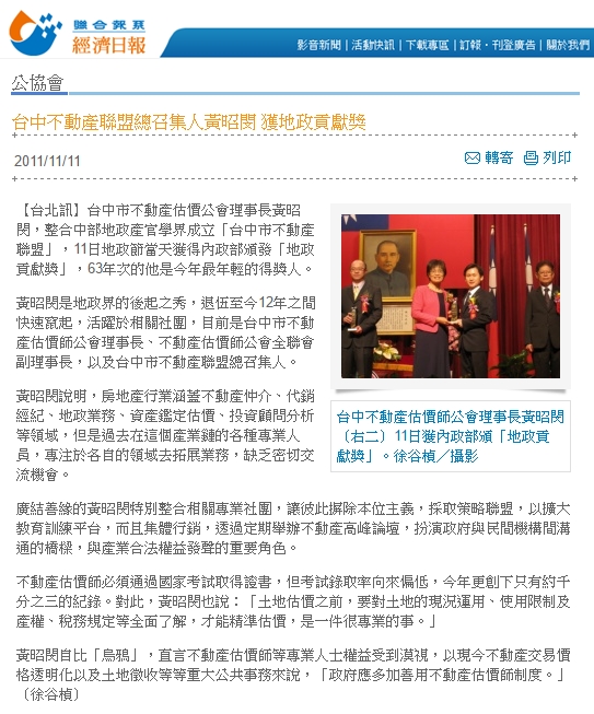 台中市不動產估價公會理事長黃昭閔,整合中部地政產官學界成立「台中市不動產聯盟」,11日地政節當天獲得內政部頒發「地政貢獻獎」,63年次的他是今年最年輕的得獎人。