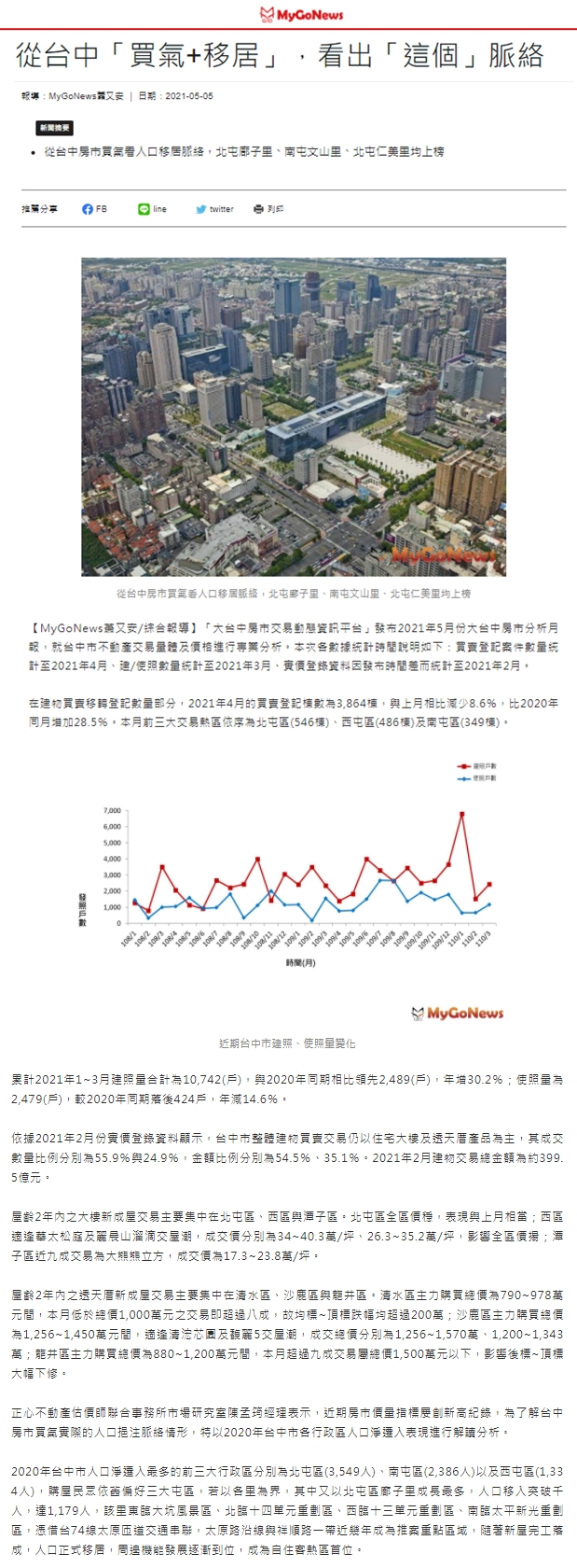 「大台中房市交易動態資訊平台」發布2021年5月份大台中房市分析月報,就台中市不動產交易量體及價格進行專業分析。本次各數據統計時間說明如下:買賣登記案件數量統計至2021年4月、建/使照數量統計至2021年3月、實價登錄資料因發布時間差而統計至2021年2月。