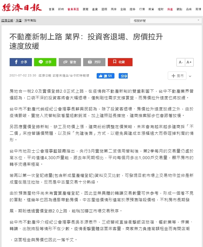 房地合一稅2.0及實價登錄2.0正式上路,在疫情與不動產新制的雙重影響下,台中不動產業界普遍認為,口袋不深的投資客將會大幅退場,僅剩剛性需求支撐買盤,而房價拉升速度也將放緩。