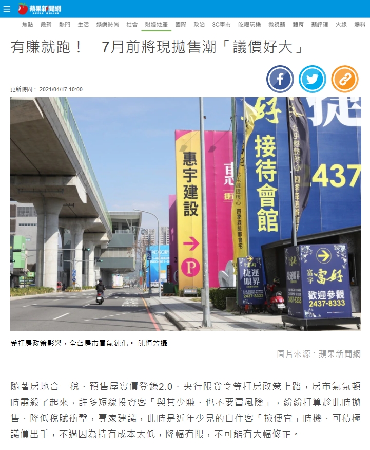 一名建商私下說「現在房市已經弱化,買方都傾向觀望,不少投資客手中短期物件都打算獲利了結,原本預計賺到50萬,如今可能30萬元就願意出售。」