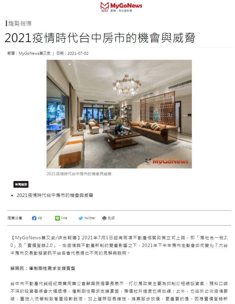 2021年7月1日起有兩項不動產相關政策正式上路,即「房地合一稅2.0」及「實價登錄2.0」,在疫情與不動產新制的雙重影響之下,2021年下半年房市走勢會如何變化?大台中房市交易動態資訊平台各會代表提出不同的見解與說明。