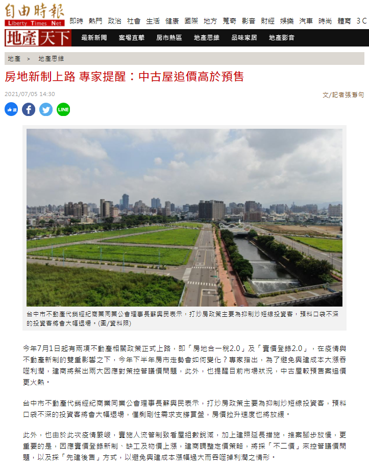 台中市地政士公會理事長藍翠霞則表示,以今年5月我國本土疫情爆發作為分水嶺,6月的買賣交易量依舊向上攀升,而央行在今年3月實施第二波信用管制後,今年第2季每月的交易量仍處於高水位,平均值達4,300戶量能,跟去年同期相比,平均每個月多出1千戶的交易量,顯示出房市的轉手流通率極高,若再以第一次登記總量(包含新成屋產權登記)資料交叉比對,可發現目前市場上的交易物件並非是新成屋在挹注拉抬,反而是中古屋交易十分熱絡。藍翠霞認為,由於預售屋物件尚未有實質的產權登記,故並無具體的轉讓交易數量可供參考,形成一個看不見的盲點,這幾年也因為通膨帶動房價,中古屋追價情形遠高於原預售階段價格,不利於房市長期發展,也盼透過實價登錄2.0正式上路,能稍加導正市場交易秩序。