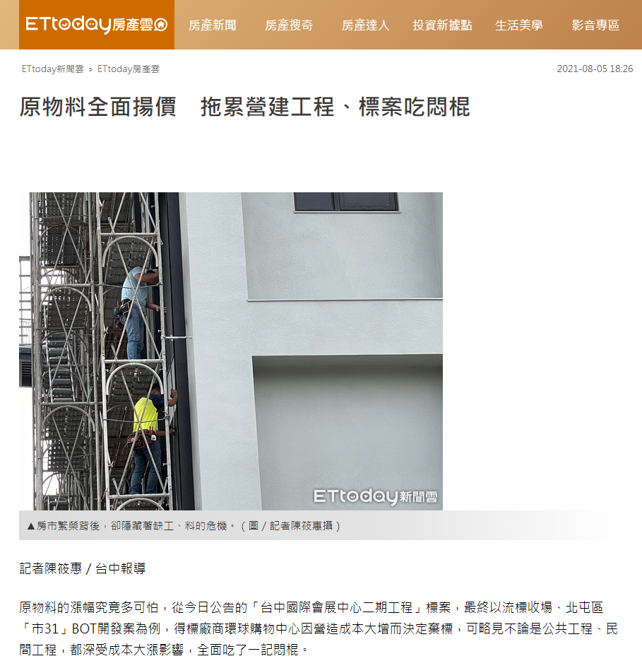 原物料的漲幅究竟多可怕,從今日公告的「台中國際會展中心二期工程」標案,最終以流標收場、北屯區「市31」BOT開發案為例,得標廠商環球購物中心因營造成本大增而決定棄標,可略見不論是公共工程、民間工程,都深受成本大漲影響,全面吃了一記悶棍。