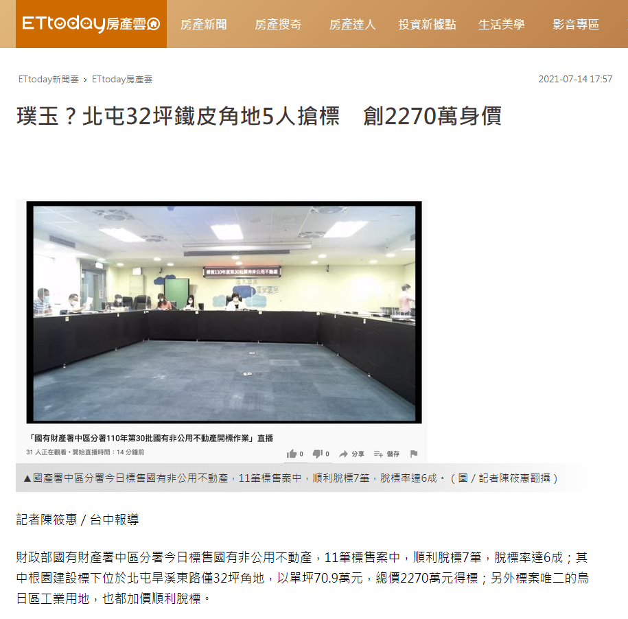 另外,此次標售案中唯二的工業用地,皆位於烏日區,第2標139坪底價2560萬元、第3標91坪底價1658萬元,分別是「詠錠機電」以單坪25萬元,總價3489萬元、「建良環保企業」以單坪22萬元,總價1995萬元脫標,2間公司皆有烏日的地緣關係。