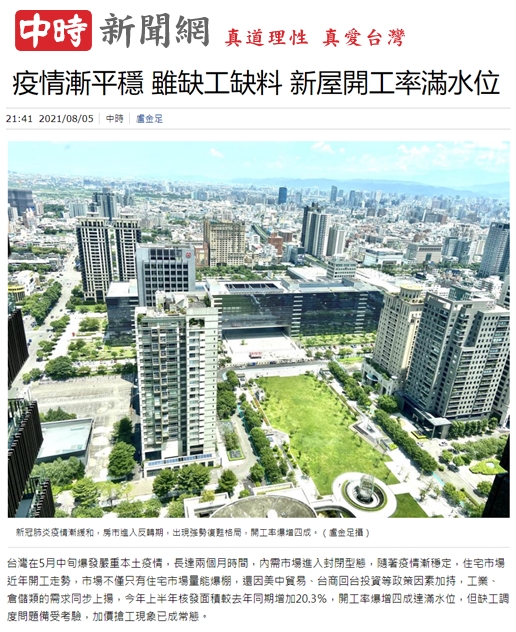 「大台中房市交易動態資訊平台」發布8月份大台中房市分析,就台中市不動產交易量體及價格進行專業分析。正心不動產估價師聯合事務所市場研究室經理陳孟筠表示,疫情屬國際性連動事件,對於我國的影響層面及程度正擴大發酵,造成營造工程上的排擠效果,缺工又缺料,營造工程人員備載量吃緊。