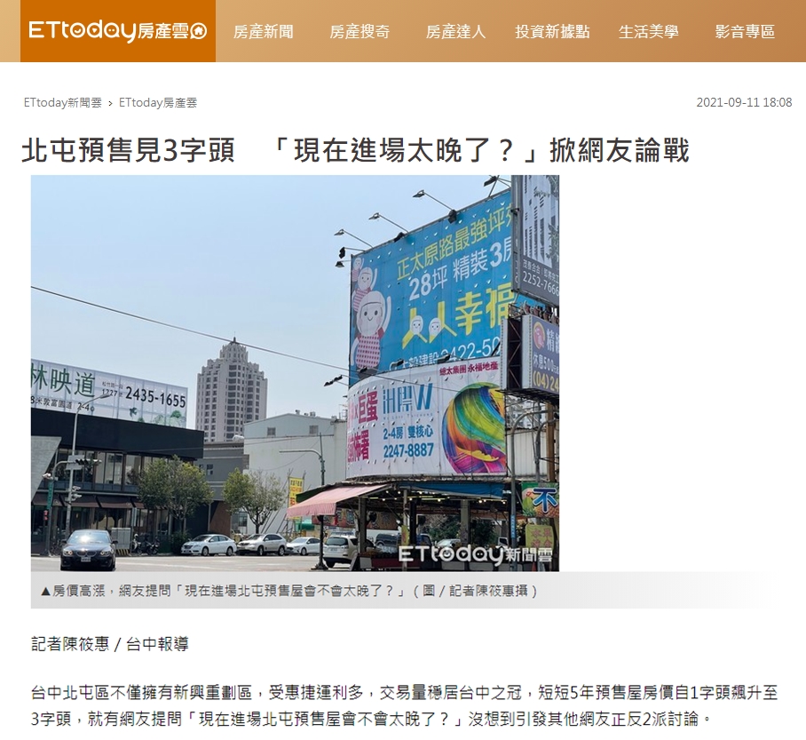 台中北屯區不僅擁有新興重劃區,受惠捷運利多,交易量穩居台中之冠,短短5年預售屋房價自1字頭飆升至3字頭,就有網友提問「現在進場北屯預售屋會不會太晚了?」沒想到引發其他網友正反2派討論。