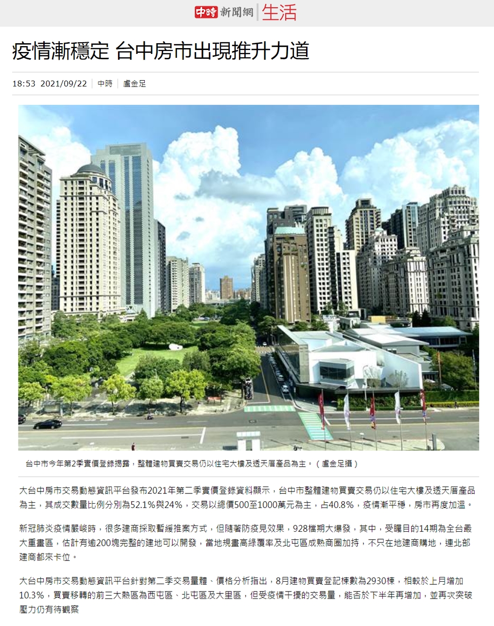 大台中房市交易動態資訊平台發布2021年第二季實價登錄資料顯示,台中市整體建物買賣交易仍以住宅大樓及透天厝產品為主,其成交數量比例分別為52.1%與24%,交易以總價500至1000萬元為主,占40.8%,疫情漸平穩,房市再度加溫。