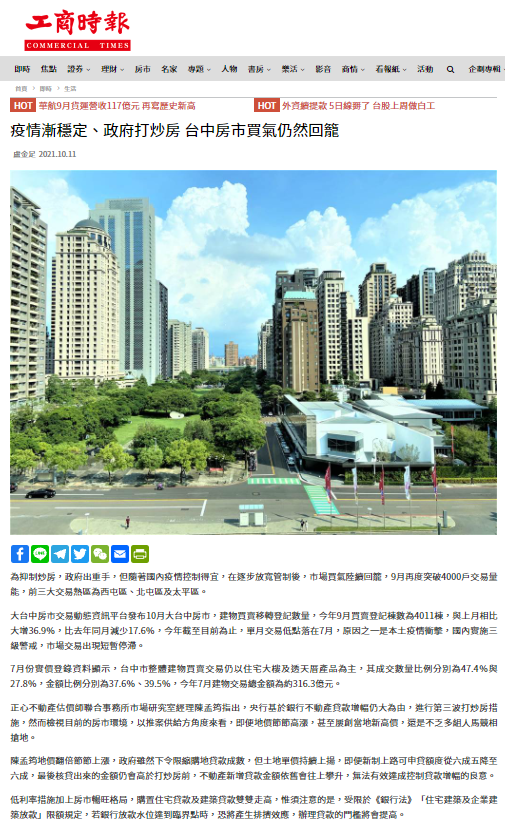 為抑制炒房,政府出重手,但隨著國內疫情控制得宜,在逐步放寬管制後,市場買氣陸續回籠,9月再度突破4000戶交易量能,前三大交易熱區為西屯區、北屯區及太平區。