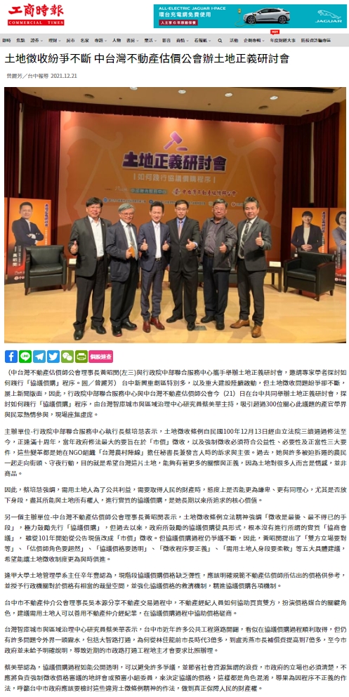 台中新興重劃區特別多,以及重大建設陸續啟動,但土地徵收問題紛爭卻不斷,屢上新聞版面,因此,行政院中部聯合服務中心與中台灣不動產估價師公會今(21)日在台中共同舉辦土地正義研討會,探討如何踐行「協議價購」程序,由台灣智庫城市與區域治理中心研究員蔡美華主持,吸引超過300位關心此議題的產官學界與民眾熱情參與,現場座無虛席。