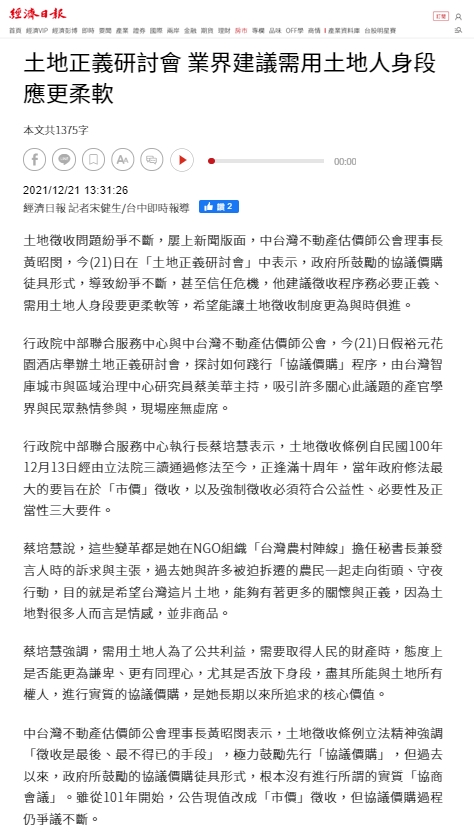 市政府的立場也必須清楚,不應讓負責強制徵收價格審議的地評會或預審小組委員,來決定協議的價格,這樣都是角色混淆,導果為因程序不正義的作法。她呼籲台中市政府應該要檢討這些違背土徵條例精神的作法,做到真正保障人民的財產權。