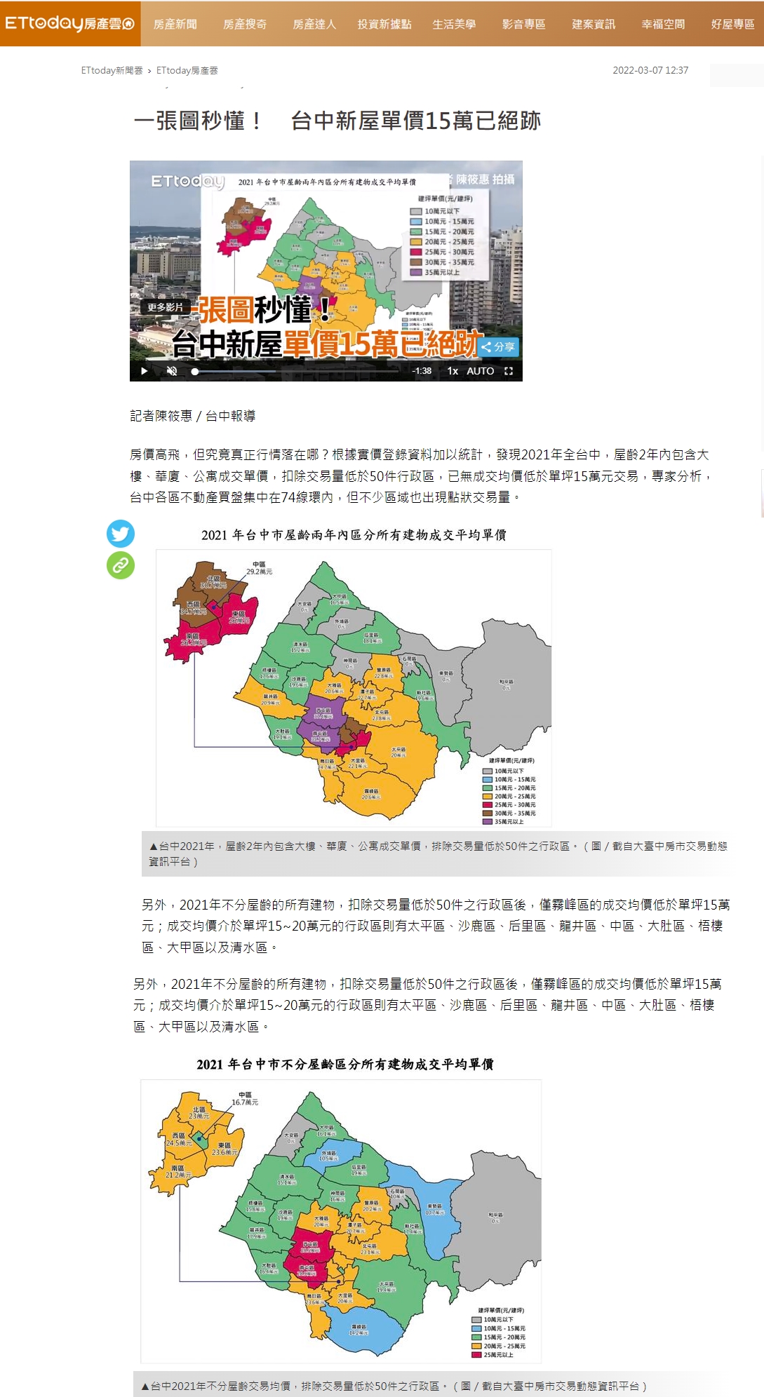 房價高飛,但究竟真正行情落在哪?根據實價登錄資料加以統計,發現2021年全台中,屋齡2年內包含大樓、華廈、公寓成交單價,扣除交易量低於50件行政區,已無成交均價低於單坪15萬元交易,專家分析,台中各區不動產買盤集中在74線環內,但不少區域也出現點狀交易量。