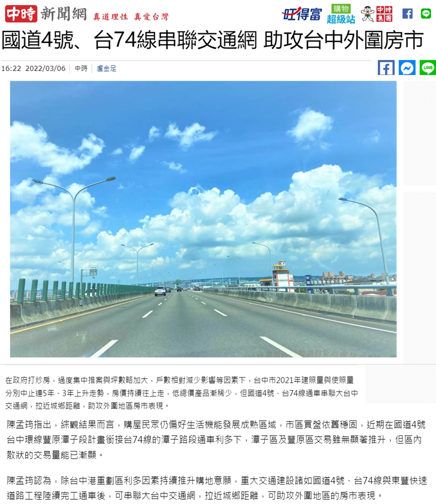 正心不動產估價師聯合事務所市場研究室經理陳孟筠認為,除台中港重劃區利多因素持續推升購地意願,重大交通建設諸如國道4號、台74線與東豐快速道路工程陸續完工通車後,可串聯大台中交通網,拉近城鄉距離,可助攻外圍地區的房市表現。