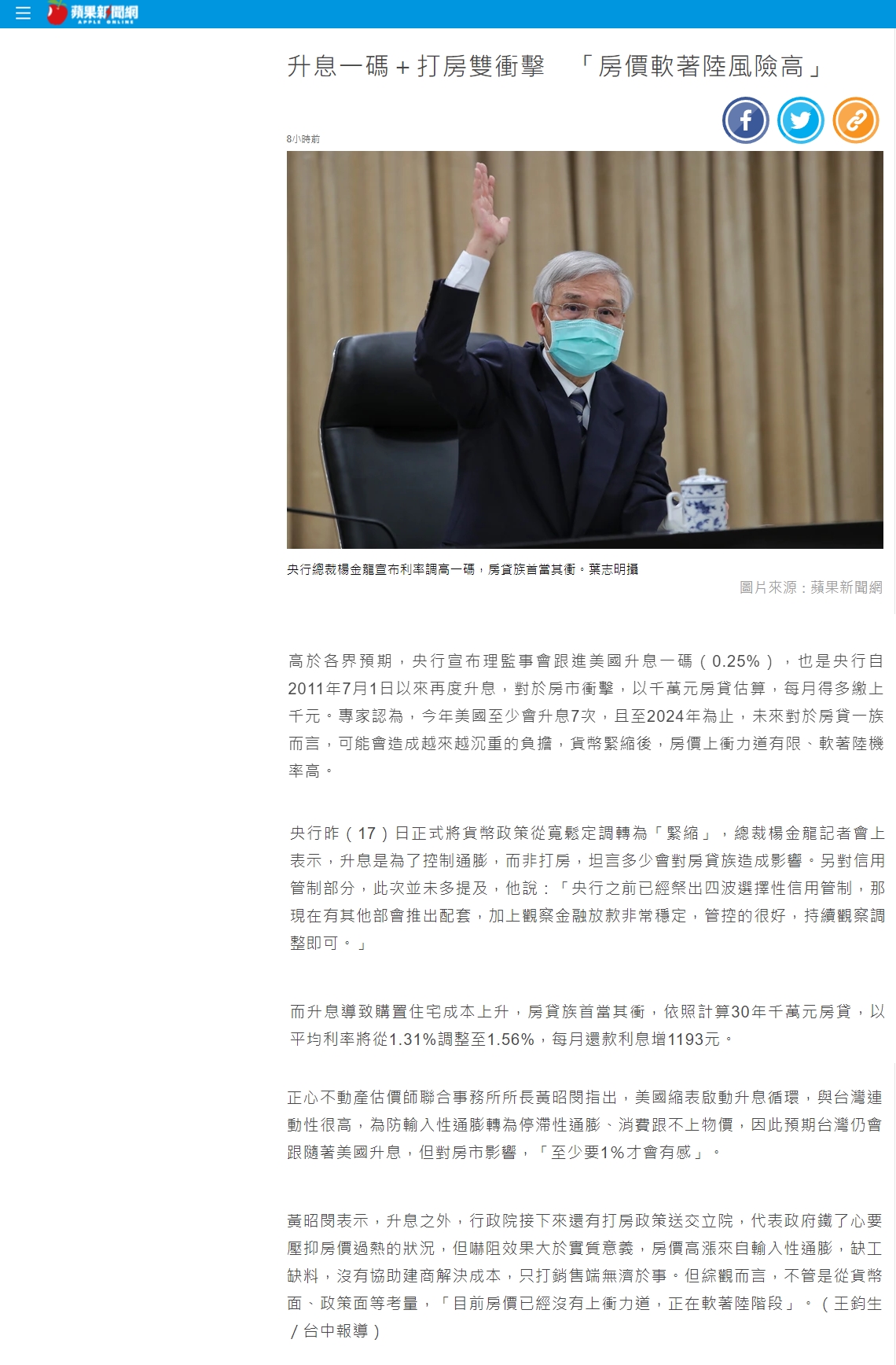 高於各界預期,央行宣布理監事會跟進美國升息一碼(0.25%),也是央行自2011年7月1日以來再度升息,對於房市衝擊,以千萬元房貸估算,每月得多繳上千元。專家認為,今年美國至少會升息7次,且至2024年為止,未來對於房貸一族而言,可能會造成越來越沉重的負擔,貨幣緊縮後,房價上衝力道有限、軟著陸機率高。