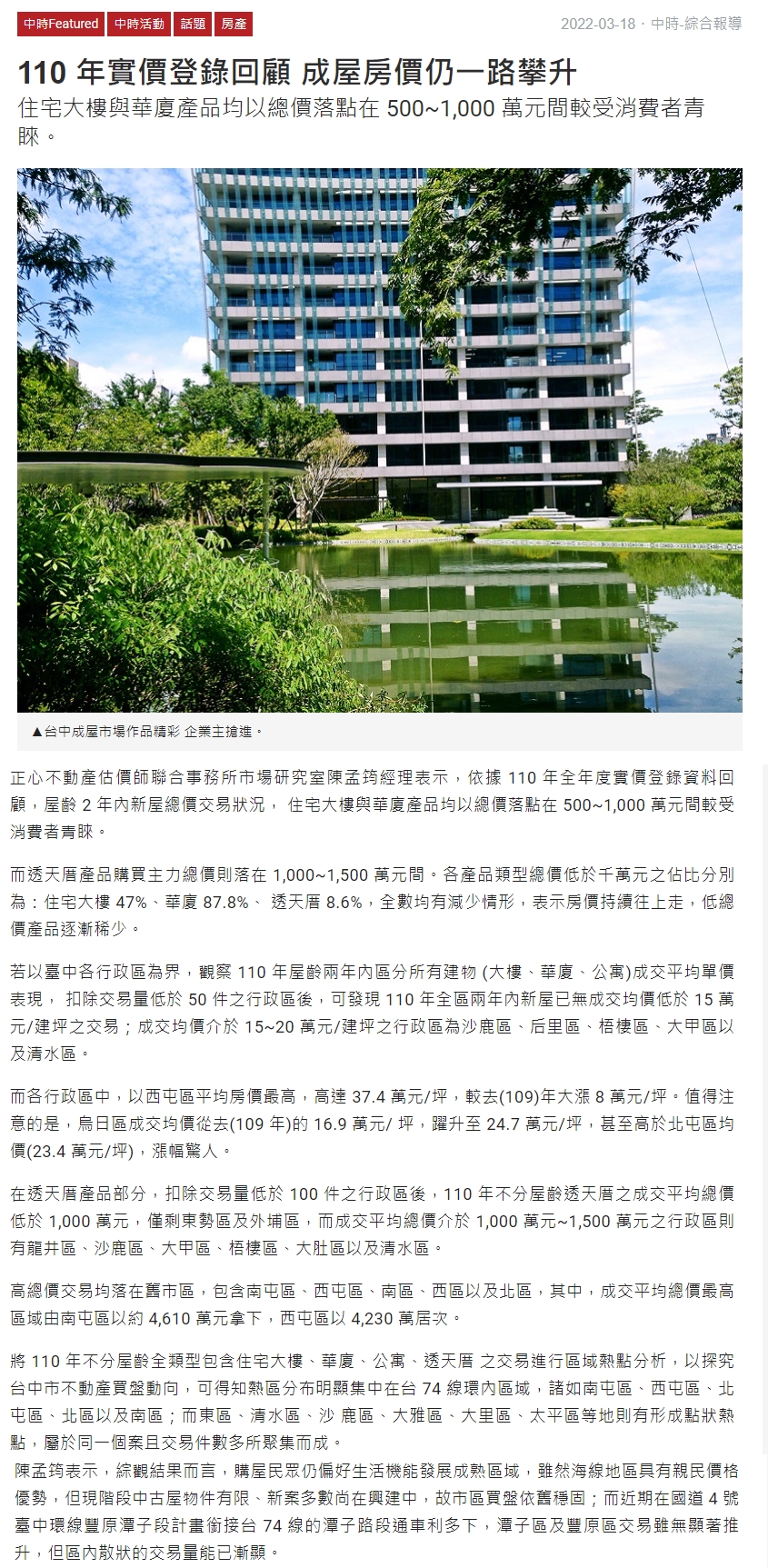 若以臺中各行政區為界,觀察 110 年屋齡兩年內區分所有建物 (大樓、華廈、公寓)成交平均單價表現, 扣除交易量低於 50 件之行政區後,可發現 110 年全區兩年內新屋已無成交均價低於 15 萬元/建坪之交易;成交均價介於 15~20 萬元/建坪之行政區為沙鹿區、后里區、梧棲區、大甲區以及清水區。