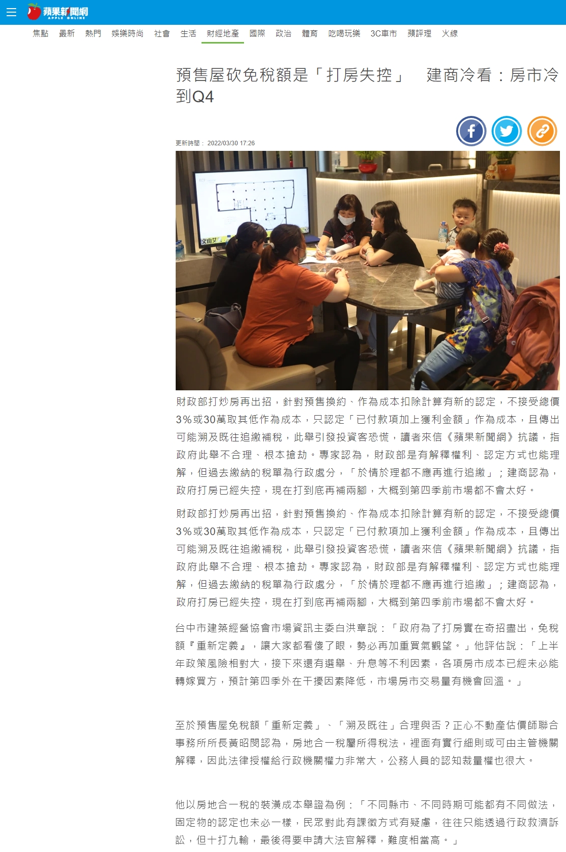 財政部打炒房再出招,針對預售換約、作為成本扣除計算有新的認定,不接受總價3%或30萬取其低作為成本,只認定「已付款項加上獲利金額」作為成本,且傳出可能溯及既往追繳補稅,此舉引發投資客恐慌,讀者來信《蘋果新聞網》抗議,指政府此舉不合理、根本搶劫。專家認為,財政部是有解釋權利、認定方式也能理解,但過去繳納的稅單為行政處分,「於情於理都不應再進行追繳」;建商認為,政府打房已經失控,現在打到底再補兩腳,大概到第四季前市場都不會太好。