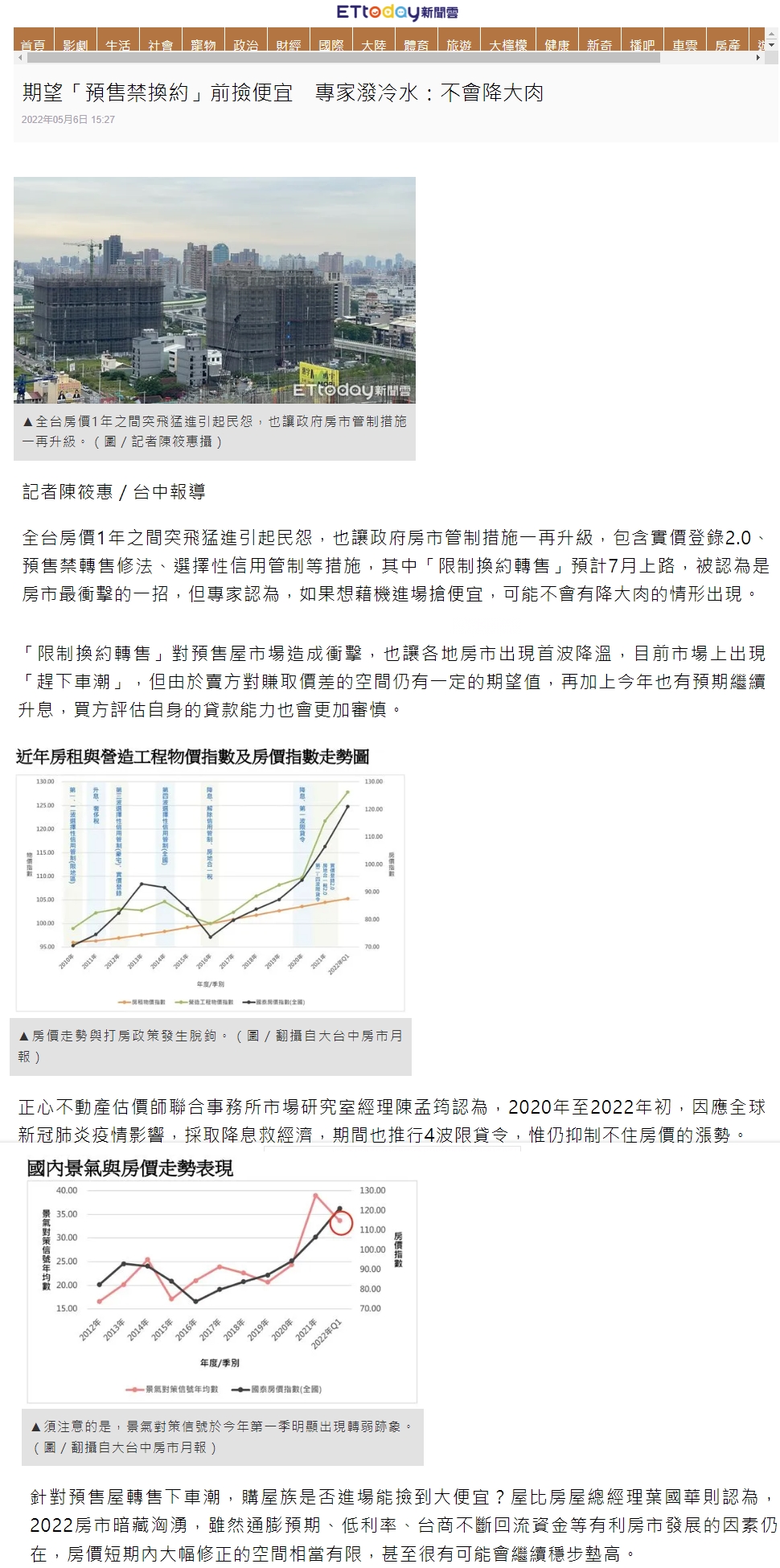 而對於房價走勢與打房政策發生脫鉤,正心不動產估價師聯合事務所市場研究室經理陳孟筠分析,營造工程大宗為國際物料,市場有需求面支撐,同時會因庫存少、物料短缺進而助漲價格。但因景氣對策信號於第一季明顯出現轉弱跡象,若後續無法止跌,房價漲勢將會有感趨緩。