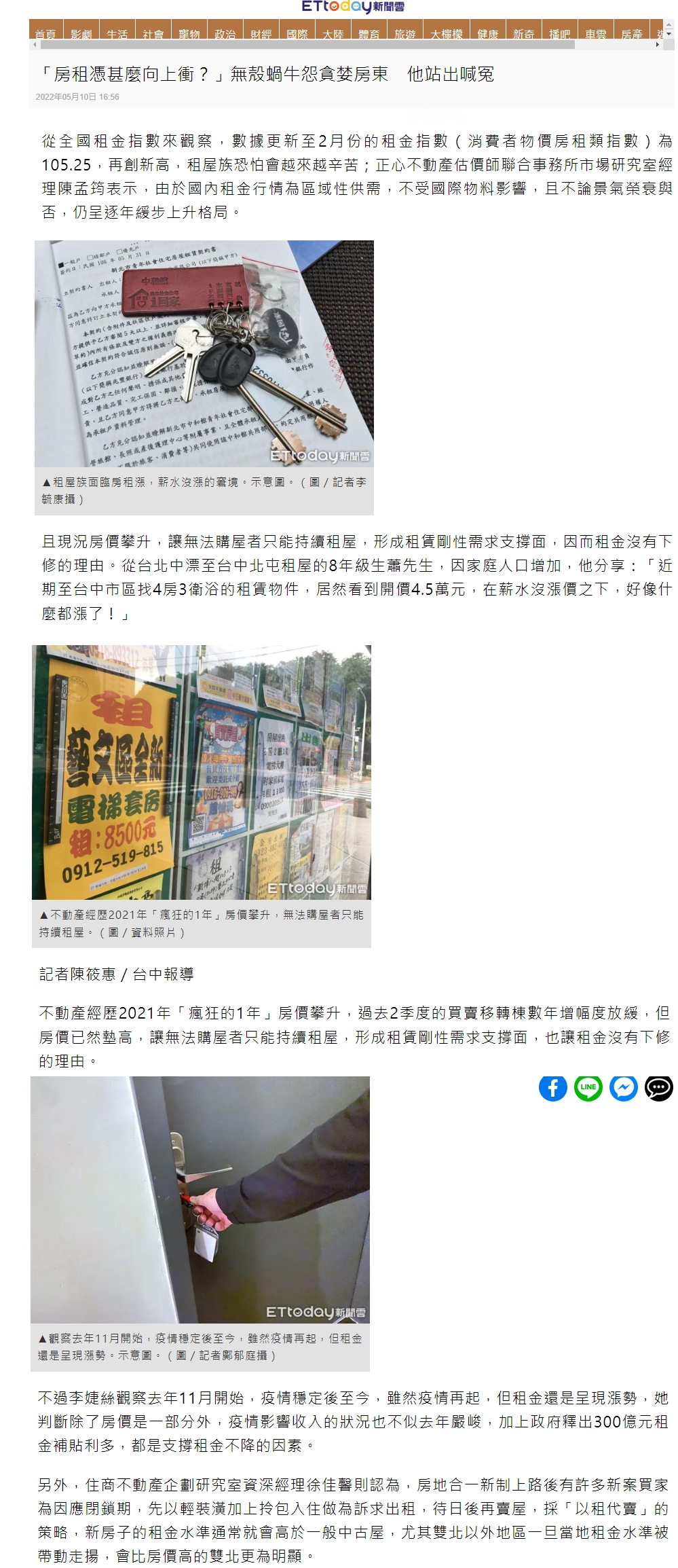 從全國租金指數來觀察,數據更新至2月份的租金指數(消費者物價房租類指數)為105.25,再創新高,租屋族恐怕會越來越辛苦;正心不動產估價師聯合事務所市場研究室經理陳孟筠表示,由於國內租金行情為區域性供需,不受國際物料影響,且不論景氣榮衰與否,仍呈逐年緩步上升格局。