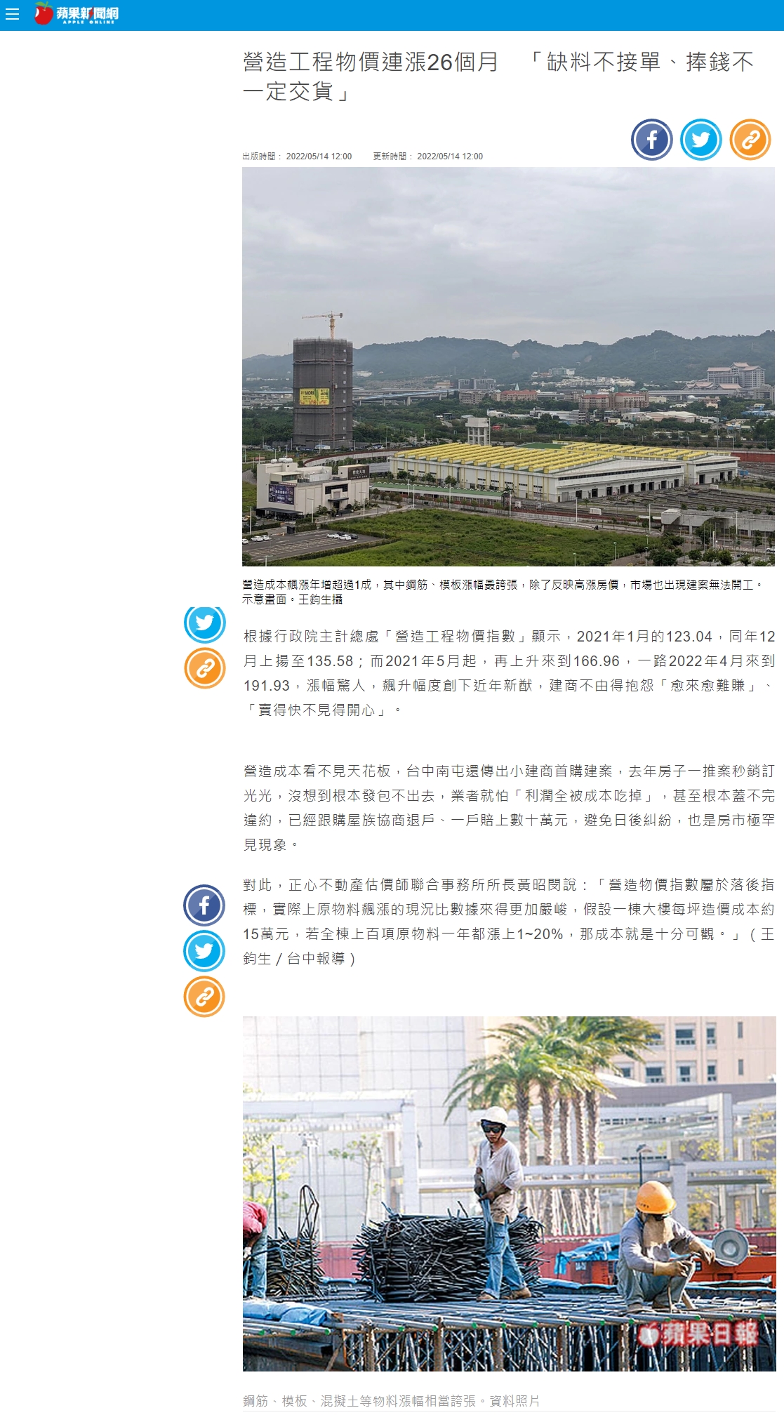 另有一名從業30年的營建業者分享,從鋼筋廠交價報價趨勢來看,2月底鋼筋單價為每噸2.23萬元,至4月下旬飆上2.51萬元新高價,先前還有單筆訂單500噸以上不接單,「意味捧著錢去買也不一定有貨」,從業以來第一次看到這種市況。他感嘆:「房價已經到了一個瓶頸,成本不可能無限制轉嫁消費者,現在經營成本壓力真的艱辛,內外交迫。」
