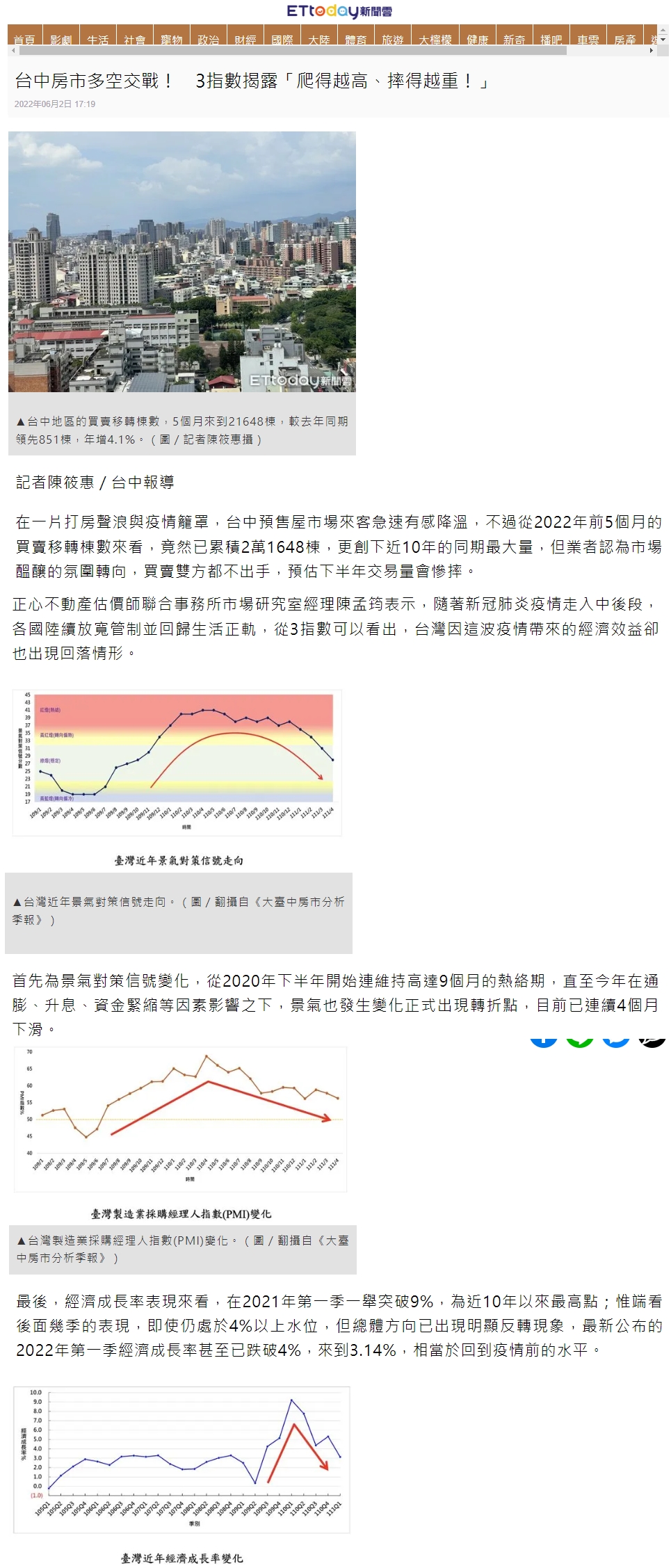 正心不動產估價師聯合事務所市場研究室經理陳孟筠認為,從上述3大指標可明顯看出台灣經濟放緩,此次疫情助漲了不動產市場,當熱浪退潮,房市的低迷期也有可能提早報到。
