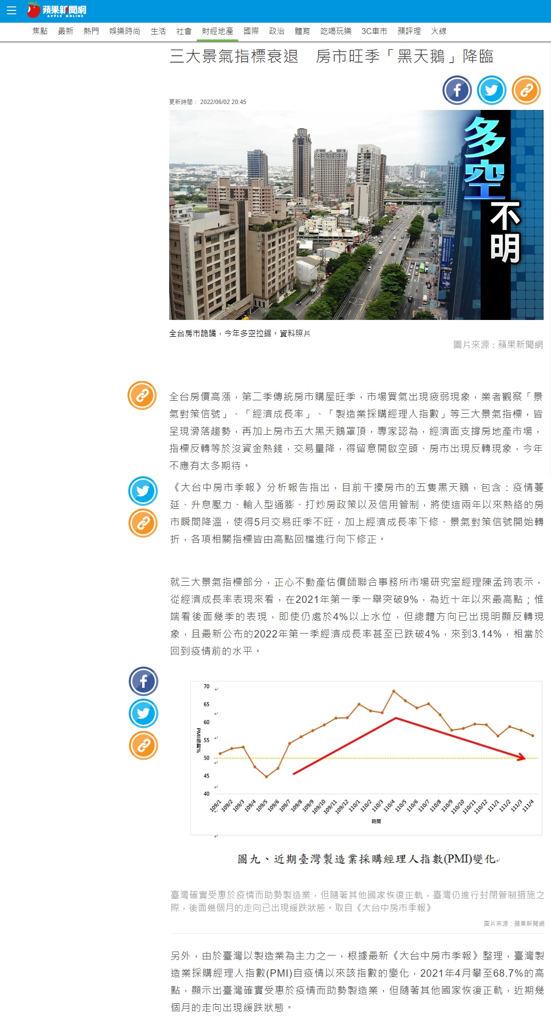 正心不動產估價師聯合事務所市場研究室經理陳孟筠認為,從上述三大指標可明顯看出臺灣經濟放緩的現象,雖然與全球情勢變化大有關聯,但反映在臺灣的內需市場則可能更加嚴峻,「此次疫情大大助漲了不動產市場,所以當熱浪退潮時,房市的低迷期也有可能提早報到」。