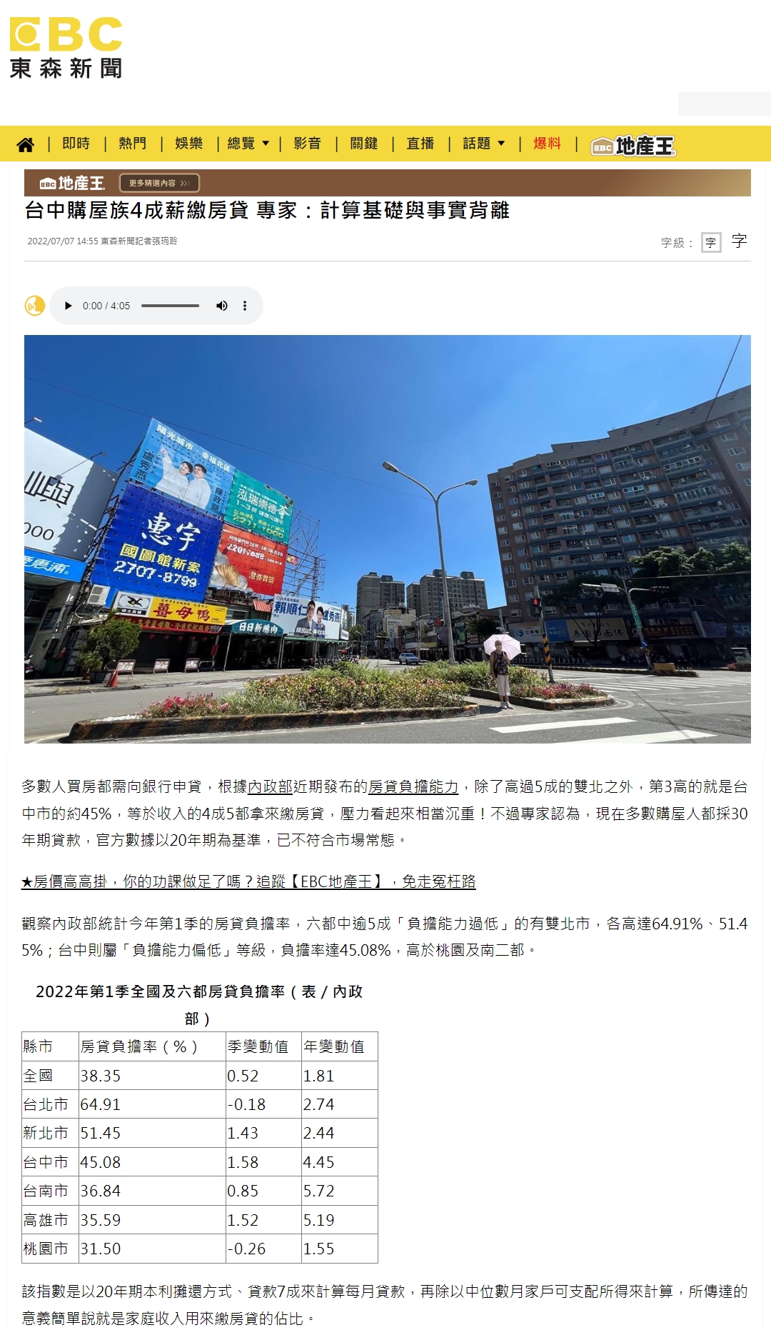 多數人買房都需向銀行申貸,根據內政部近期發布的房貸負擔能力,除了高過5成的雙北之外,第3高的就是台中市的約45%,等於收入的4成5都拿來繳房貸,壓力看起來相當沉重!不過專家認為,現在多數購屋人都採30年期貸款,官方數據以20年期為基準,已不符合市場常態。