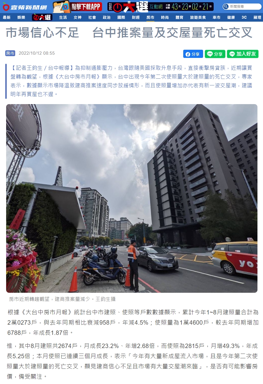 為抑制通膨壓力,台灣跟隨美國採取升息手段,直接衝擊房貸族,近期讓買盤轉為觀望,根據《大台中房市月報》顯示,台中出現今年第二次使照量大於建照量的死亡交叉,專家表示,數據顯示市場降溫致建商推案速度同步放緩情形,而且使照量增加亦代表有新一波交屋潮,建議明年再買屋也不遲。