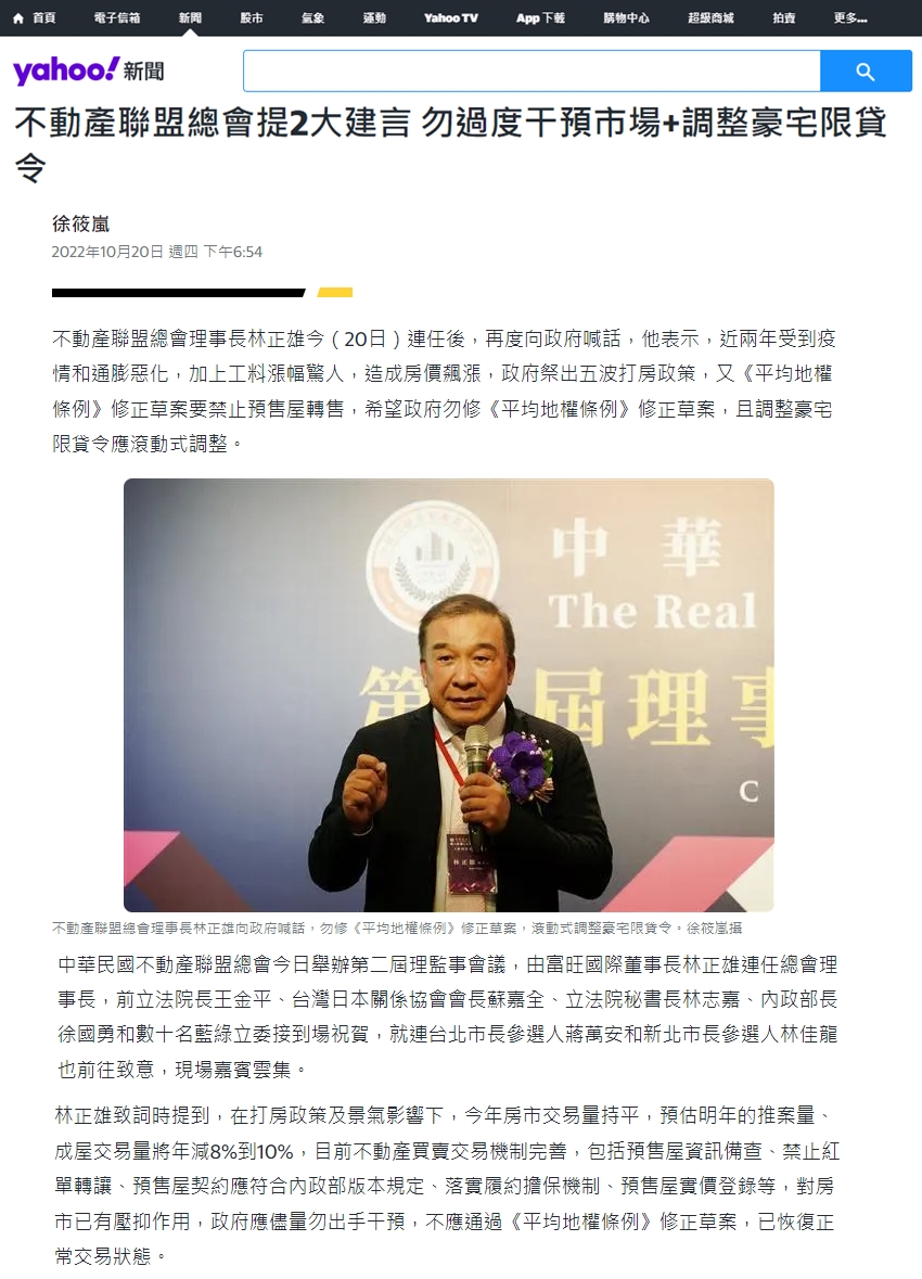 不動產聯盟總會理事長林正雄今(20日)連任後,再度向政府喊話,他表示,近兩年受到疫情和通膨惡化,加上工料漲幅驚人,造成房價飆漲,政府祭出五波打房政策,又《平均地權條例》修正草案要禁止預售屋轉售,希望政府勿修《平均地權條例》修正草案,且調整豪宅限貸令應滾動式調整。