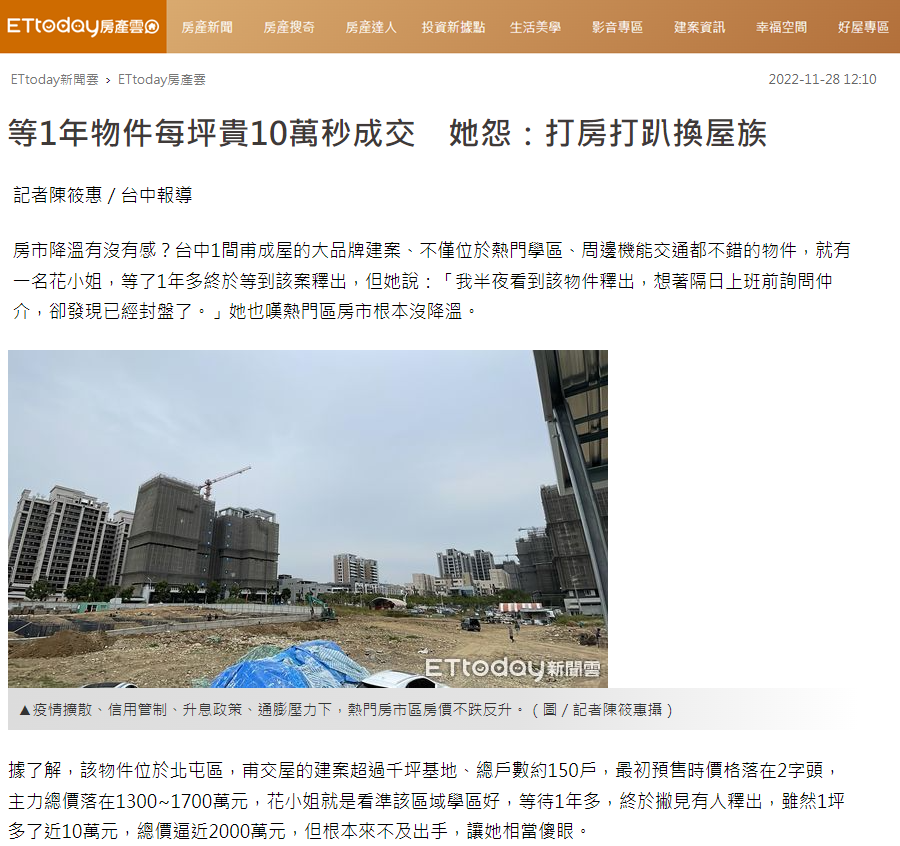 據了解,該物件位於北屯區,甫交屋的建案超過千坪基地、總戶數約150戶,最初預售時價格落在2字頭,主力總價落在1300~1700萬元,花小姐就是看準該區域學區好,等待1年多,終於撇見有人釋出,雖然1坪多了近10萬元,總價逼近2000萬元,但根本來不及出手,讓她相當傻眼。