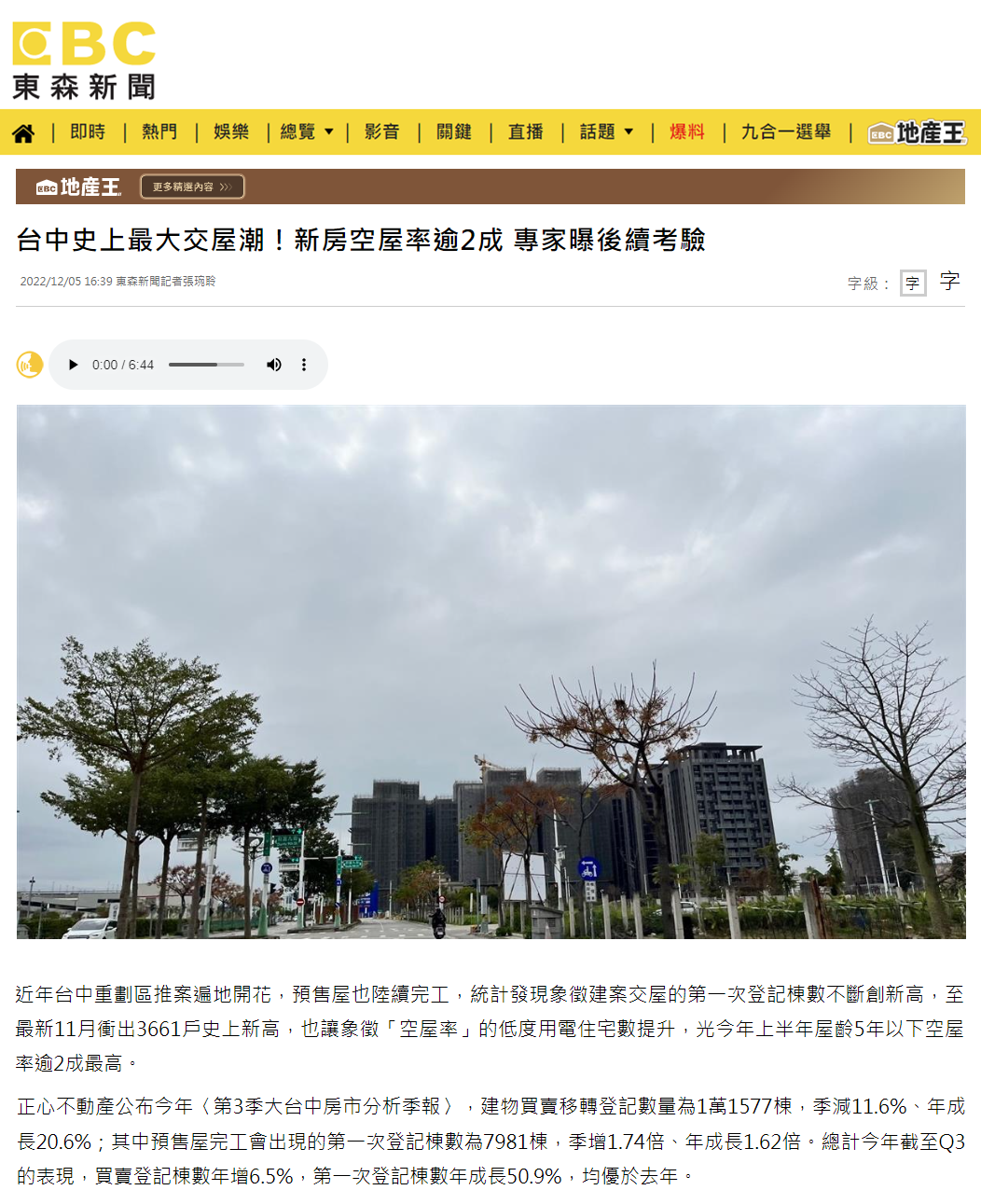 對於第一次登記棟數大增且連續兩季有交屋潮挹注,正心不動產估價師聯合事務所市場研究室經理陳孟筠表示,因適逢年底交屋潮旺季,台中市第一次登記棟數也開始爆出大量。