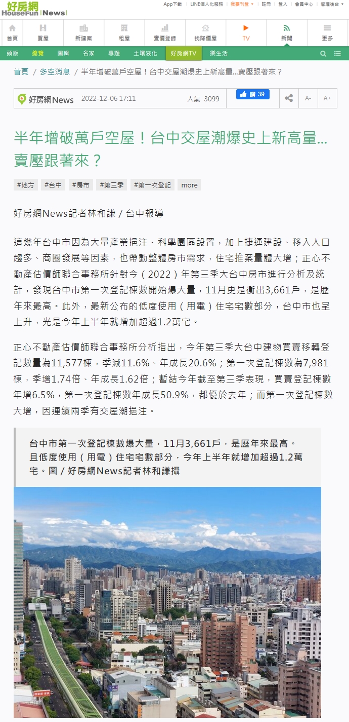 這幾年台中市因為大量產業挹注、科學園區設置,加上捷運建設、移入人口趨多、商圈發展等因素,也帶動整體房市需求,住宅推案量體大增;正心不動產估價師聯合事務所針對今(2022)年第三季大台中房市進行分析及統計,發現台中市第一次登記棟數開始爆大量,11月更是衝出3,661戶,是歷年來最高。此外,最新公布的低度使用(用電)住宅宅數部分,台中市也呈上升,光是今年上半年就增加超過1.2萬宅。