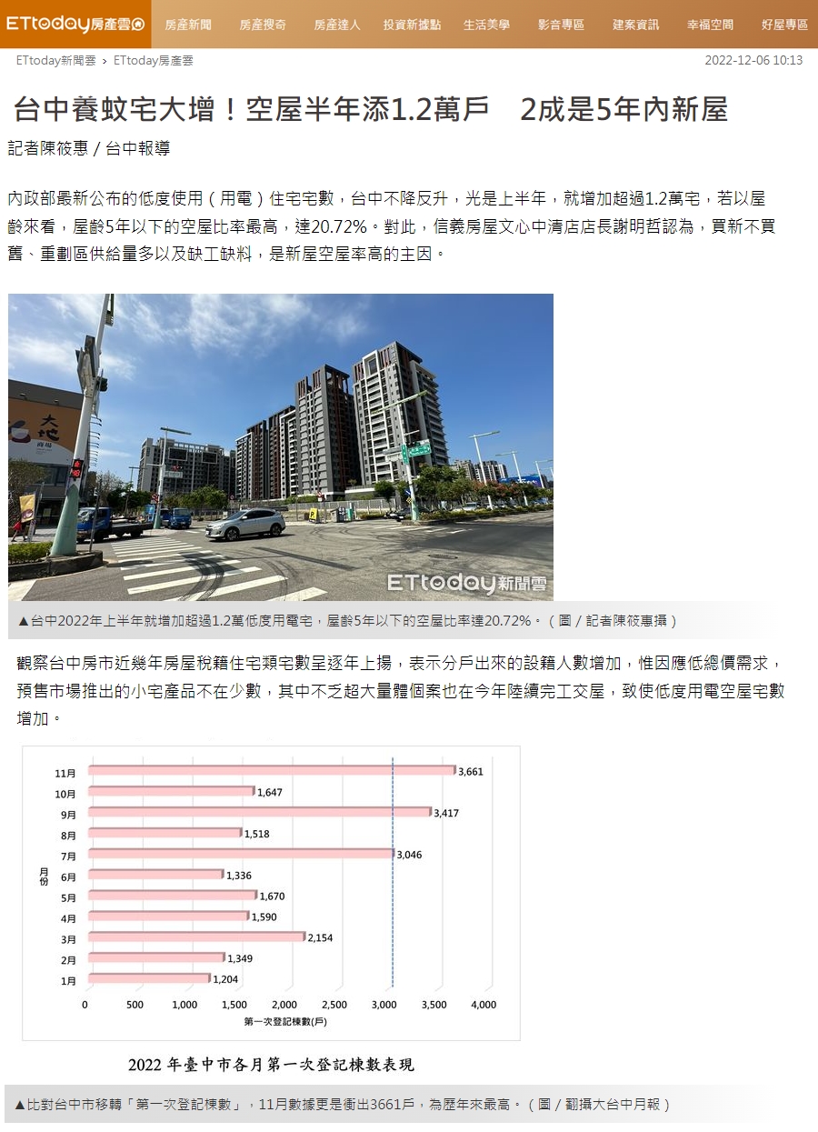 內政部最新公布的低度使用(用電)住宅宅數,台中不降反升,光是上半年,就增加超過1.2萬宅,若以屋齡來看,屋齡5年以下的空屋比率最高,達20.72%。對此,信義房屋文心中清店店長謝明哲認為,買新不買舊、重劃區供給量多以及缺工缺料,是新屋空屋率高的主因。