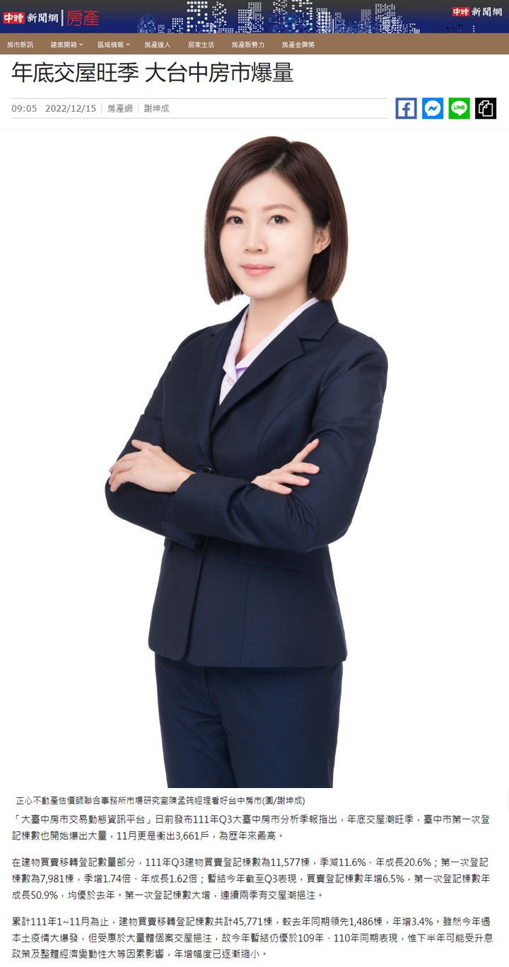 「大臺中房市交易動態資訊平台」日前發布111年Q3大臺中房市分析季報指出,年底交屋潮旺季,臺中市第一次登記棟數也開始爆出大量,11月更是衝出3,661戶,為歷年來最高。