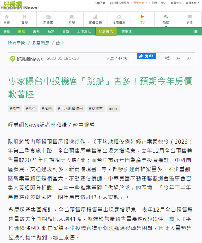 政府將強力整頓預售屋投機炒作,《平均地權條例》修正案最快今(2023)年第二季實施上路,全台預售屋轉售量出現大增現象,去年12月全台預售轉售量較2021年同期相比大增4成;而台中市近年因為產業投資進駐、中科園區發展、交通建設利多、新商場規畫...等,都吸引建商推案量多,不少重劃區新案量體更是相當大。不動產估價師、中華民國不動產聯盟總會監事會召集人黃昭閔分析說,台中一些推案量體「供過於求」的區塊,「今年下半年房價將逐步軟著陸,明年房市估計也不太樂觀」。