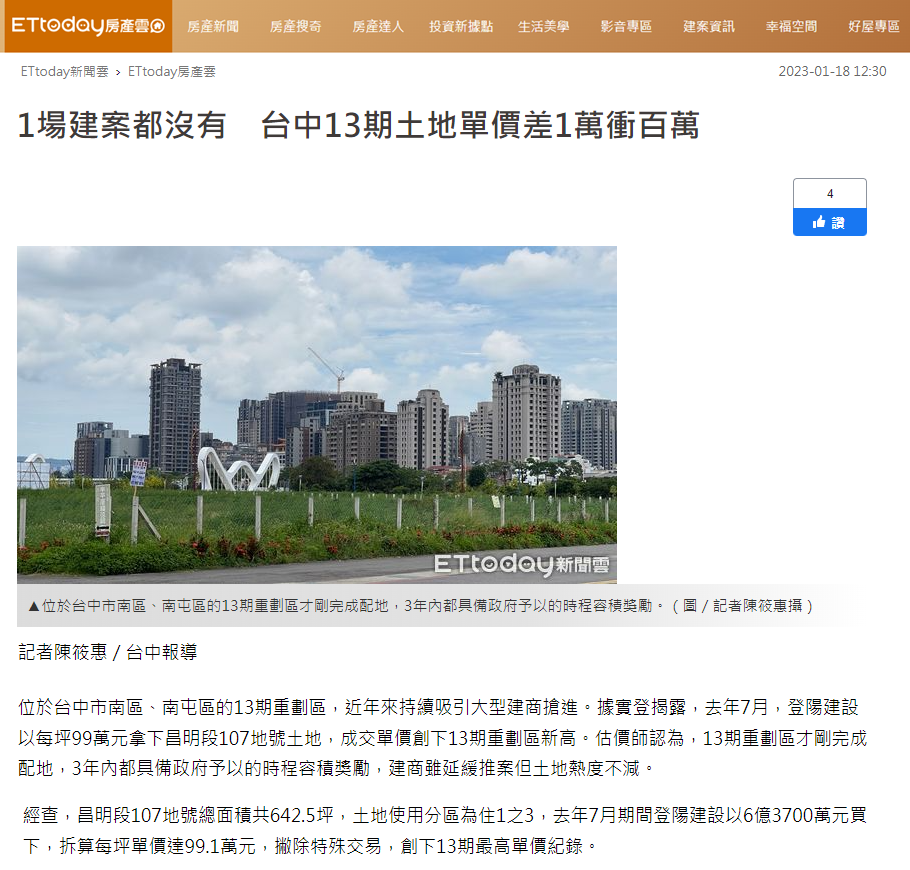 位於台中市南區、南屯區的13期重劃區,近年來持續吸引大型建商搶進。據實登揭露,去年7月,登陽建設以每坪99萬元拿下昌明段107地號土地,成交單價創下13期重劃區新高。估價師認為,13期重劃區才剛完成配地,3年內都具備政府予以的時程容積獎勵,建商雖延緩推案但土地熱度不減。